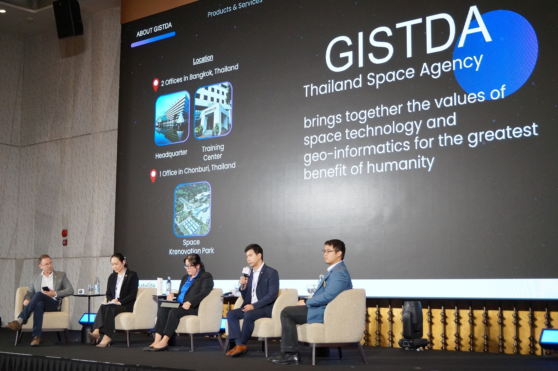 “Earth Intelligence for Food Security: Sustainable Management of Rice Ecosystems,” opened the symposium’s discussions. This session was moderated by Dr. Bjoern Ole Sander, Senior Scientist and Country Representative of the International Rice Research Institute (IRRI) in Thailand, who guided the exchange on EO-enabled water management, sustainable rice cultivation and credible greenhouse gas (GHG) monitoring. Panelists were Mrs. Wimolpat Bumbudsanpharoke Khamkanya, Senior Expert in Economic Analysis for Water Projects at the Office of the National Water Resources (ONWR); Ms. Amornrat Intrman, Director of the Thailand Rice Science Institute, Rice Department; Mr. Panu Nueangjumnong, Acting Head of the Agricultural Management Division at GISTDA; and Dr. Parkin Maskulrath, Lecturer in Environmental Science at Kasetsart University.