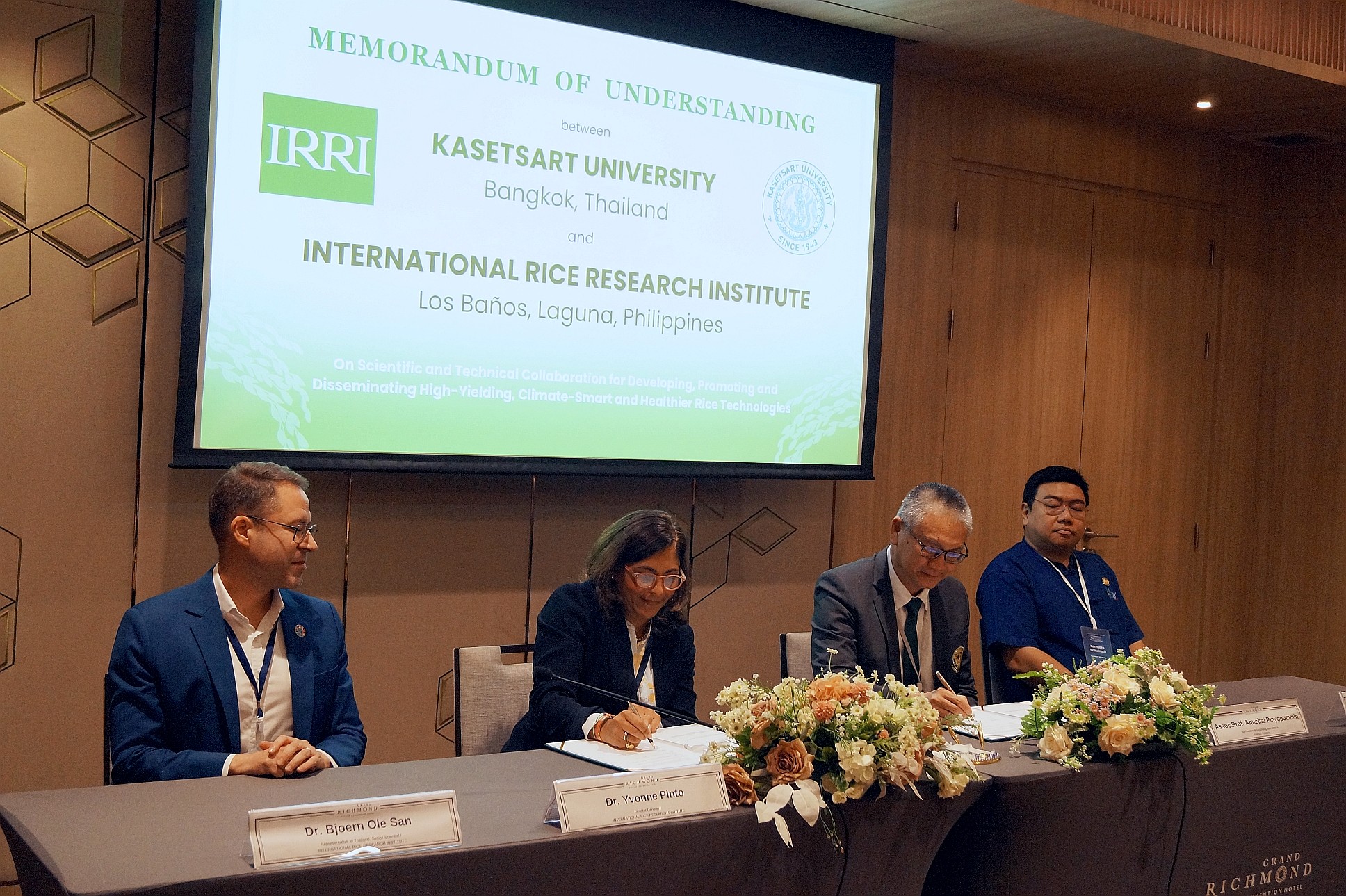 The signing ceremony was presided over by Dr. Yvonne Pinto, Director General of IRRI, alongside Assoc. Prof. Anuchai Pinyopummin, Vice President for Kamphaeng Saen Campus, Prof. Dr. Kornsorn Srikulnath, Assistant to the President for Research and Internationalization of Kasetsart University, and Dr. Bjoern Ole Sander, Senior Scientist and Thailand Country Representative of IRRI.